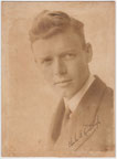 American aviator, author, inventor, explorer, and social activist. He became famous for making the first solo transatlantic airplane flight in 1927. Signed photograph “Charles A. Lindbergh”. 8.0 x 11.0 inch, sepia photograph, n.p., n.d. The attractive image depicting a young Lindbergh in a head and shoulders pose. Signed in bold black fountain pen ink to a clear area to the lower right corner of the photograph. Mounted on a same size photographers mount, illegible note at the bottom, age wear, toning and foxing stains mostly to borders, else fine condition.