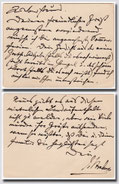 German composer, pianist, conductor of the Romantic period and one of the greatest composers of all time. Autograph letter signed “J. Brahms”. Card, gold edges, 4.5 x 3.5 inch, recto and verso, n.p., n.d. To an unknown friend/ poet. In German, in full: “Lieber Freund. Deinen freundlichen Gruß angemessen erwiedernd wünsche ich Dir angenehmste Sommerferien. Dein Gedicht aus der neuen Goethe-Ausgabe (falls Du es noch erinnerst) steht bereits im Hempel u. das schöne Wort (falls Du es noch weißt) fand ich auch bei mir schon unterstrichen. Neues giebt es aus diesem winterlichen Landaufenthalt nicht zu melden, aber wie viele würden ihre Grüße aussenden, wenn sie wüßten, daß Dir u. deiner Familie die herzlichsten sagt. Dein J. Brahms“. Translated: „Dear friend. Properly returning your friendly greeting, I wish you a pleasant summer holiday. Your poem from the new Goethe edition (if you still remember it) is already in the Hempel and I found the beautiful word (if you still remember it) already underlined in my case. There is nothing new to report from this wintry stay in the country, but how many would send their greetings if they knew that you and your family are saying the warmest. Yours, J. Brahms”. Handling wear, minor corner wear, else fine condition. Gustav Hempel (1819-1877) was a German publisher. Hempel became famous through an ambitious project to publish a collection of editions of German classics, including Goethe, Schiller, Herder and so on.