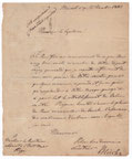 Napoléon Bonaparte was a French military and political leader who rose to prominence during the French Revolution and its associated wars. Interesting letter signed “Nap”. 2 pages, 8.0 x 12.25 inch, Milan, 1805 May 27 (Milan 7 Prairial an 13). On the top left corner a four line note in secretary hand: “Renvoyè au Minstre de la Guerre pour autoriser le General (Jean-Antoine) Verdier à tenir un detachement de cinquante hommes dans ce port. Milan 7 prairial an 13.” And signed in Napoleon’s hand with his typical “Nap” in dark black ink. Translated: “Sent to the Ministry of War to authorize General (Jean-Antoine) Verdier to hold a detachment of fifty men in this port”. The note is on an interesting letter from Claude-Joseph-Parfait Derville-Maléchard, diplomat and chargé d'affaires under Napoleon (1774-1842). Autograph letter signed “Derville-Malèchard”. 2 pages, 8.0 x 12.25 inch, black wax seal, Milan, 1805 May 25 (Milan 5 Prairial an 13). As “Ministre plénipotaire” of Lucca (1803-1806) to Louis Alexandre Berthier (1753-1815) Minister of War and Marshal of France. The letter in French, in part: “L’occupation et la défense des cotes de la Mediterranée, qui, depuis Vado jusques à Livourne, embrassent le littoral des Etas de Génes, royaume d’Italie et de Toscane, viennent d’etre confiées aux troupes francaises. Il est probable que le petit port de Viareggio, qui est compris dans cette ligne militaire, n’aura pas fixè l’attention de Sa Majesté, vu le peu d’étendue et d’importance de la cote Lucquoise. J’ai l’honneur de faire remarquer à Votre Excellence que la mer entre Massa et Livourne forme une anse circulaire dont le port de Viareggio est le centre …” He then describes the favorable meteorological and strategic position of the port of Viareggio and proposes that the fort of the city be manned with 50 men. Emperor Napoleon issued the appropriate order with the four line note as described above. With a further marginal note and initial signature by the Minister of War: "M'général pour présenter les Ordres d'exécution. Mal. B.”. Mailing folds, black wax seal with two small holes, else good condition.