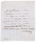 French novelist and playwright. The novel sequence La Comédie humaine, which presents a panorama of post-Napoleonic French life, is generally viewed as his magnum opus. Autograph letter signed “de Balzac”. 1p., 5.25 x 6.25 inch, n.p. (Paris), n.d. (about 1842), dark black ink. In French, telling the unidentified recipient that he is not in the country, but near them and if they would like to visit him then to go to rue Pigalle no. 16 and to ask for him with the doorman. The final sentence crossed out, a few words of the address to verso including the word “Barbe”. Minor marks and small pinhole to blank upper left corner, else good condition. The French author George Sand lived at the rue Pigalle 16 address with her lover, the composer Fréderic Chopin, from 1841 to 1842, where Balzac was a frequent visitor. The word “Barbe” on the address side suggests that the letter was sent to the Englishman Edward Sainte-Barbe (1794-1858), the long-term lover of Astolphe de Custine (1790-1857), a notable French dandy and writer.