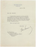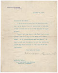 26. President of the United States. Typed Letter Signed “Theodore Roosevelt”. 1p., 7.0 x 9.0 inch, embossed “White House, Washington” stationery, 1907 November 21. Addressed to Miss Emma Allison in Nashville, Tennessee. A get-well letter to Emma sharing about the arrival of a new Roosevelt family dog. In full: “Dear Little Miss Emma: I am so sorry to learn that you have been sick, and I am so pleased that you are getting on well now. I hope you will soon be out of bed and just as bright as ever. Since I have come back to the White House we have gotten a new little dog for the White House called Scamp. He is a black-and-tan and very merry. We hope he will take the place of a very dear little dog called Skip which belonged to Archie and which died last summer." Lightly toned with smoothed folds, mailing fold, scattered soiling throughout, mounting remnants on verso do not affect the letter, else good condition. A really sweet letter. Emma Vaughn Allison, daughter of his friend John Allison, was twelve years old when President Roosevelt sent her this letter. The second paragraph of Roosevelt's letter refers to a new White House dog, named Scamp. The Roosevelt family had many pets in the White House, including the dog named Skip as well as small bear, a lizard, a pig, guinea pigs, and a pony.