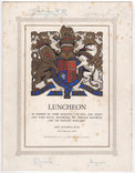 Elizabeth II. - Queen of the United Kingdom and other Commonwealth realms from 6 February 1952 until her death in 2022. George VI. - King of the United Kingdom and the Dominions of the British Commonwealth from 11 December 1936 until his death in 1952. The royal family make their historic debut visit to South Africa. Port Elizabeth luncheon menu with rare union of signatures of the Queen Mother, King George VI., and Princesses Elizabeth and Margaret. Original menu from a special luncheon honoring the Royal family’s historic visit to Port Elizabeth, South Africa on February 26-27, 1947. Three pages, 9.0 x 11.5 inch, signed in the upper and lower borders of the front cover in fountain pen by Queen Elizabeth, The Queen Mother, “Elizabeth R.,” King George VI., “George R. I.,” and their two princess daughters, “Elizabeth” and “Margaret.” The front cover reads: “Luncheon, In Honour of Their Majesties the King and Queen and Their Royal Highnesses the Princess Elizabeth and the Princess Margaret, Port Elizabeth Club, 27th February 1947.” With a short edge tear and moderately foxing throughout, else good condition. Accompanied by an original souvenir program for “The Royal Visit to Port Elizabeth, February 1947,” and by an original souvenir program for “The Coronation of Her Majesty Queen Elizabeth II.” The royal family embarked on a royal tour of South Africa that lasted from February to April 1947 and included visits to several cities and towns across South Africa. It was an important event, as it marked the first visit by a reigning British monarch to South Africa.