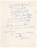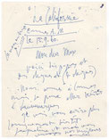 Spanish painter, sculptor, printmaker, ceramicist, stage designer, poet, playwright and one of the greatest and most influential artists of the 20th century. Picasso to his friend and financial advisor. Attractive autograph letter signed in blue ballpoint pen, signed “Picasso”. 1p, 8.25 x 10.5 inch, “La Californie” Cannes A(lpes)M(aritimes). 1960 September 1. A fine handwritten letter to his friend and financial advisor Max Pellequer. In French, in full: “Mon cher Max Voici les papiers et des chèques et (4 chèques) Nous sommes à Cannes mais je pense aller bientôt à Vauvenargues. Je vais vous écrire plus longuement bientôt Jacqueline et moi vous envoyons nos meilleurs amities. Je vous embrasse.” Translated: “My dear Max, here are the papers and some checks and (4 checks) we are in Cannes, but I think I will go to Vauvenargues soon. I will write to you more detailed soon. Jacqueline and I send you our best regards. I send you kisses.” Mailing folds, handling wear, else fine condition. Banker and collector Max Pellequer was introduced to Picasso in 1914 by his uncle by marriage André Level. He quickly became one of Picasso's most important collectors and his financial advisor for over 30 years. Pellequer's interest in his art began as early as the 1910s when he purchased a Picasso bronze from the art dealer Ambroise Vollard. During the 1930s and 1940s, as Picasso's personal banker, he secured and enhanced the painter's wealth and allowed him to settle comfortably in the South of France. Picasso created a superb ex-libris on copper for him, bought him paintings including La Mer à L'Estaque by Cézanne (now in the Picasso museum), and offered him a few other works. Pellequer assembled a vast collection of paintings by the great masters of modern art: Degas, Raoul Dufy, Paul Gauguin, Fernand Léger, Henri Matisse, Joan Miró, Modigliani, and Maurice Utrillo, which are today preserved in the most important international museums. Jacqueline Picasso or Jacqueline Roque (1926-1986) was the muse and second wife of Pablo Picasso.