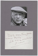 Spanish painter, sculptor, printmaker, ceramicist, stage designer, poet, playwright and one of the greatest and most influential artists of the 20th century. Among his most famous works are the proto-Cubist Les Demoiselles d'Avignon (1907) and the anti-war painting Guernica (1937). Fine autograph note signed “Picasso”. 1p., 6.0 x 4.0 inch (visible), no place, no date, written in dark black ink. A fine handwritten note in Picasso’s hand, in French: “Nos amitiés pour vous trois je vous embrasse”. Translated: “Our friendships for you three I kiss you”. Handsomely matted in gray with a photograph of Picasso to an overall of 7.75 x 11.75 inch. Both items removable affixed with photo corners. Fine condition.
