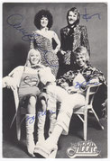 Swedish pop group formed by Agnetha Fältskog (1950), Björn Ulvaeus (1945), Benny Andersson (1946), and Anni-Frid Lyngstad (1945). They became one of the most commercially successful acts in the history of popular music. Semi-glossy signed photograph. 4.0 x 6.0 inch, n.p. n.d. (circa 1974), signed in blue ballpoint by Agnetha Fältskog, Björn Ulvaeus, Benny Andersson and Anni-Frid Lyngstad. Minor corner wear, else in fine condition.
