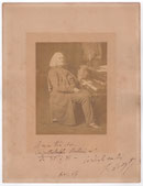 Hungarian Romantic era composer, virtuoso pianist and conductor. His prowess at the keyboard earned him a reputation as perhaps the greatest virtuoso in the history of the instrument. Impressive oversized signed and inscribed sepia photograph. 9.0 x 11.75 inch, n.p., May (18)86, signed and inscribed to the lower mount: „A mon très cher Belloni, Imperturbable Belloni - de 35 à 86, Cordiale amitié, F. Liszt“ (Translated: "To my very dear Belloni, Imperturbable Belloni - from 35 to 86, Cordial friendship, F. Liszt") and additionally dated „May 86“ in his hand. The image, 4.5 x 6.0 inch, showing the composer and pianist seated in a full-length pose before his piano and was signed only two months before passing away. Some age toning, otherwise good condition. Very likely inscribed to Gaetano Belloni (1810?-1887) Franz Liszt's Italian secretary and manager. Belloni acted as a kind of agent for Liszt, assisting him in various organizational and business tasks.