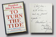 35. President of the United States. Signed book AS PRESIDENT. Book: “To Turn The Tide”. NY: Harper & Brothers, First Edition, 1962. Hardcover with dust jacket, 6.0 x 8.5 inch, 235 pages. Signed and inscribed in black ink: “To Fritz Erler - with esteem - and very personal regards - John F Kennedy May 1962 Washington D.C.” Fritz Erler, Deputy Chairman of the Social Democratic Party of Germany visited JFK at The White House oval office, May 7, 1962 and JFK presented this book to Erler with a fine personal dedication. A photograph of both in the oval office and with the book in Erler’s hand is online at the JFK Library website. The book is on the autograph market for the first time and comes directly from a descendant of Fritz Erler. Autographic condition: fine. Book condition: very good, dust jacket with minor handling wear, pages slightly discolored. Fritz Erler (1913-1967) was a German politician representing the Social Democratic Party (SPD). From 1953 to 1957, he was Deputy Chairman of the Defense Committee of the Bundestag, the West German parliament. In this role, Erler played an important role in drafting the legislation that ensured democratic control of the Bundeswehr, West Germany's new armed forces. Excellent provenance and one of the finest JFK signed books AS PRESIDENT ever offered. Comes together with my book “John F. Kennedy - autograph study” - about 90 pages with hundreds of signatures (authentic, secretary, Autopen, stamps, facsimile etc.).
