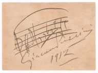 Italian composer whose operas are among the important operas played as standards. Excellent autograph musical quotation signed in full “Giacomo Puccini”. 4.25 x 3.0 inch, n.p., 1912. The three opening bars of the aria "Sì. Mi chiamano Mimì" (“Yes they call me Mimi”) from his famous opera "La Boheme". In very fine condition. The world premiere of La Bohème was in Turin on 1 February 1896 at the Teatro Regio conducted by the 28-year-old Arturo Toscanini. Since then, La Bohème has become part of the standard Italian opera repertory and is one of the most frequently performed operas worldwide.